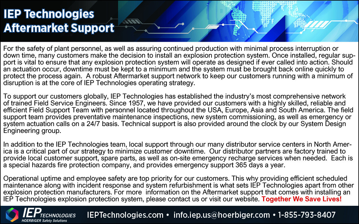 Operational uptime and employee safety are top priority for our customers. This why providing efficient scheduled maintenance along with incident response and system refurbishment is what sets IEP Technologies apart from other explosion protection manufacturers. For more information on the Aftermarket support that comes with installing an IEP Technologies explosion protection system, please contact us. Together We Save Lives!